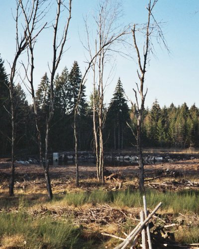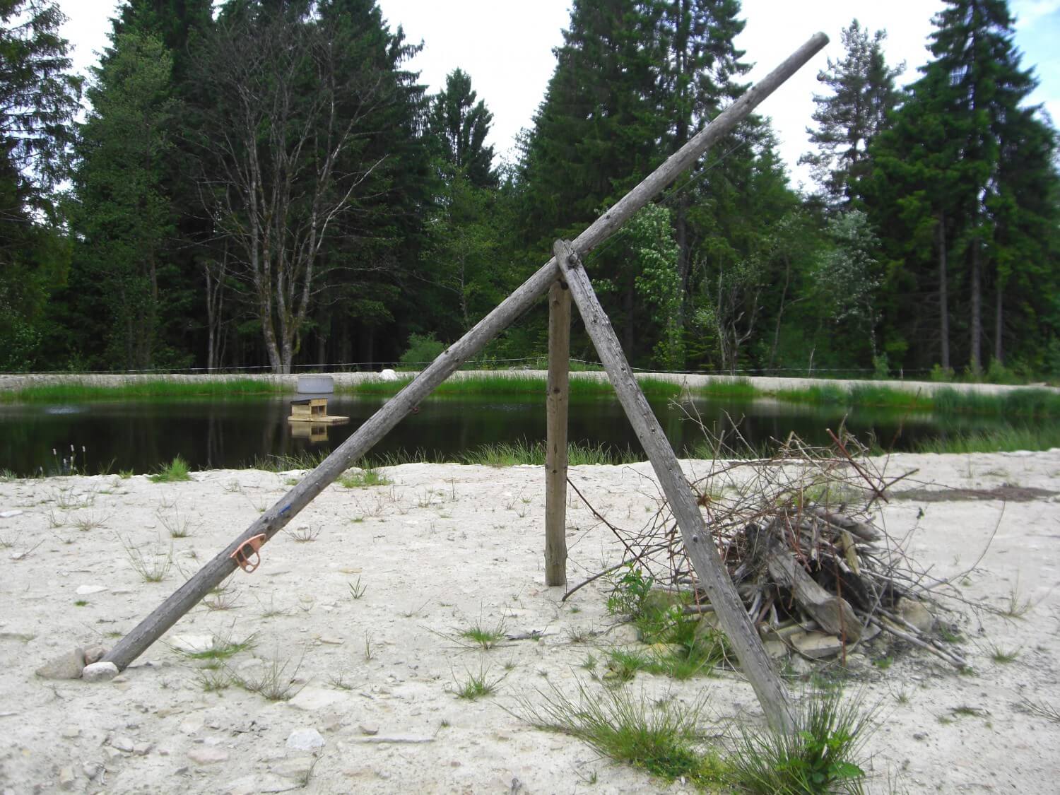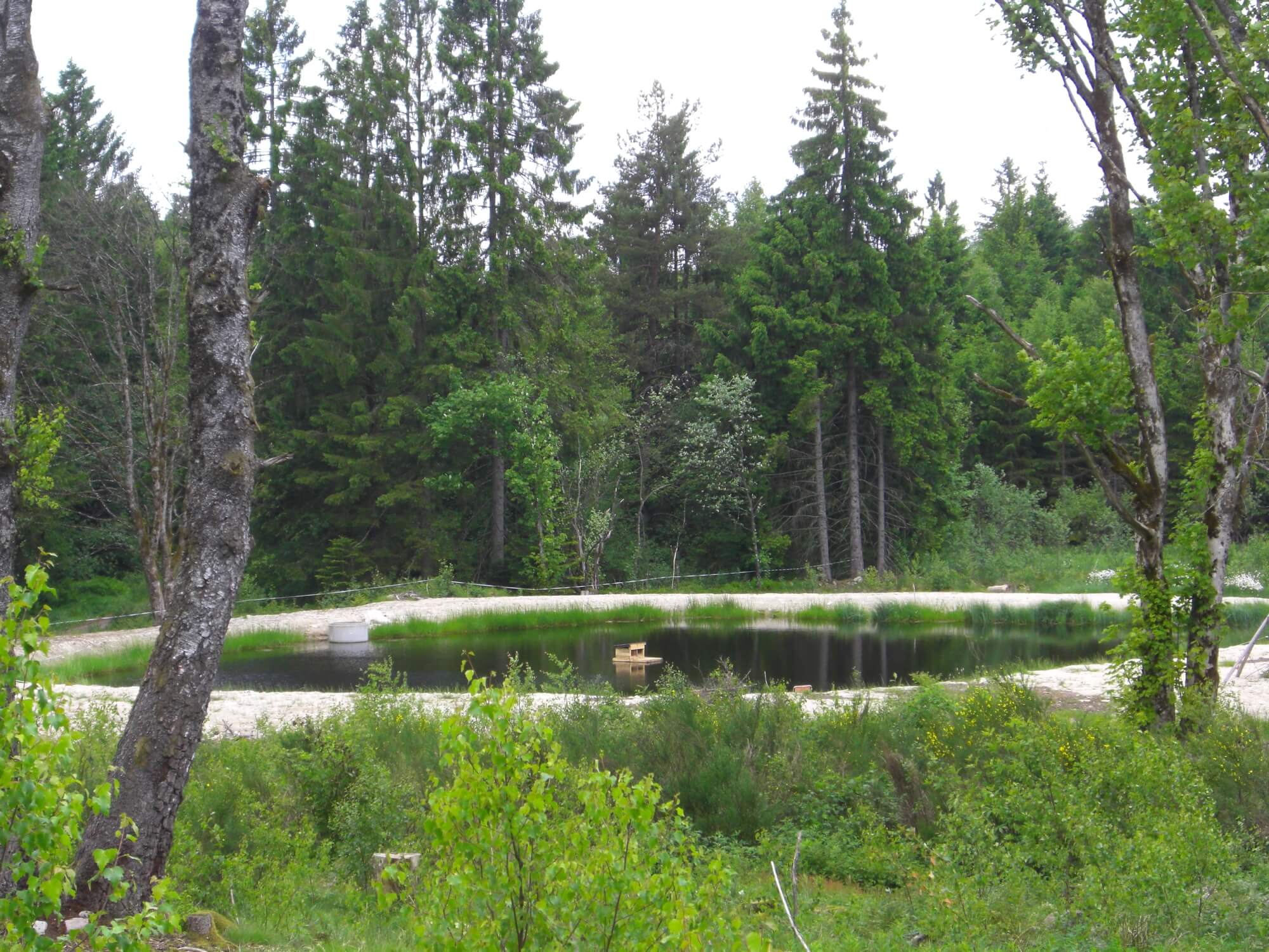 Inzwischen hat sich das Gewässer in die Umgebung eingebunden und ein Gleichgewicht hat sich zwischen Tieren und Pflanzen eingestellt. Die Ränder des Weihers sind wieder mit Pioniergehölzen bewachsen und neben Birken haben sich erstaunlicher Weise auch Kiefern etabliert, die auf dieser Meereshöhe selten sind. Die mergelhaltige sandige Uferböschung, die der Aushub bildete, scheinen sie zu mögen.