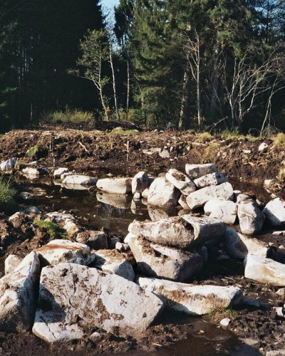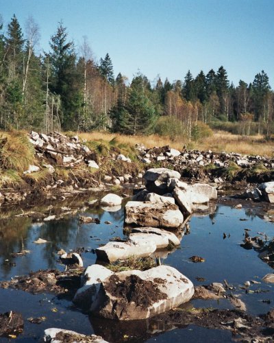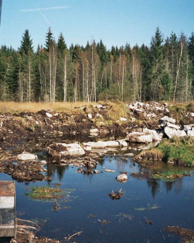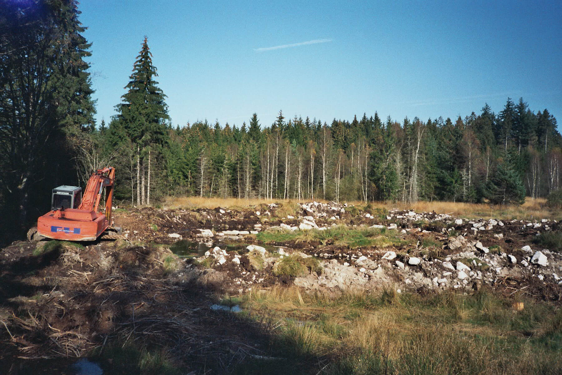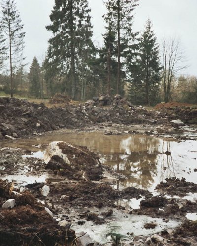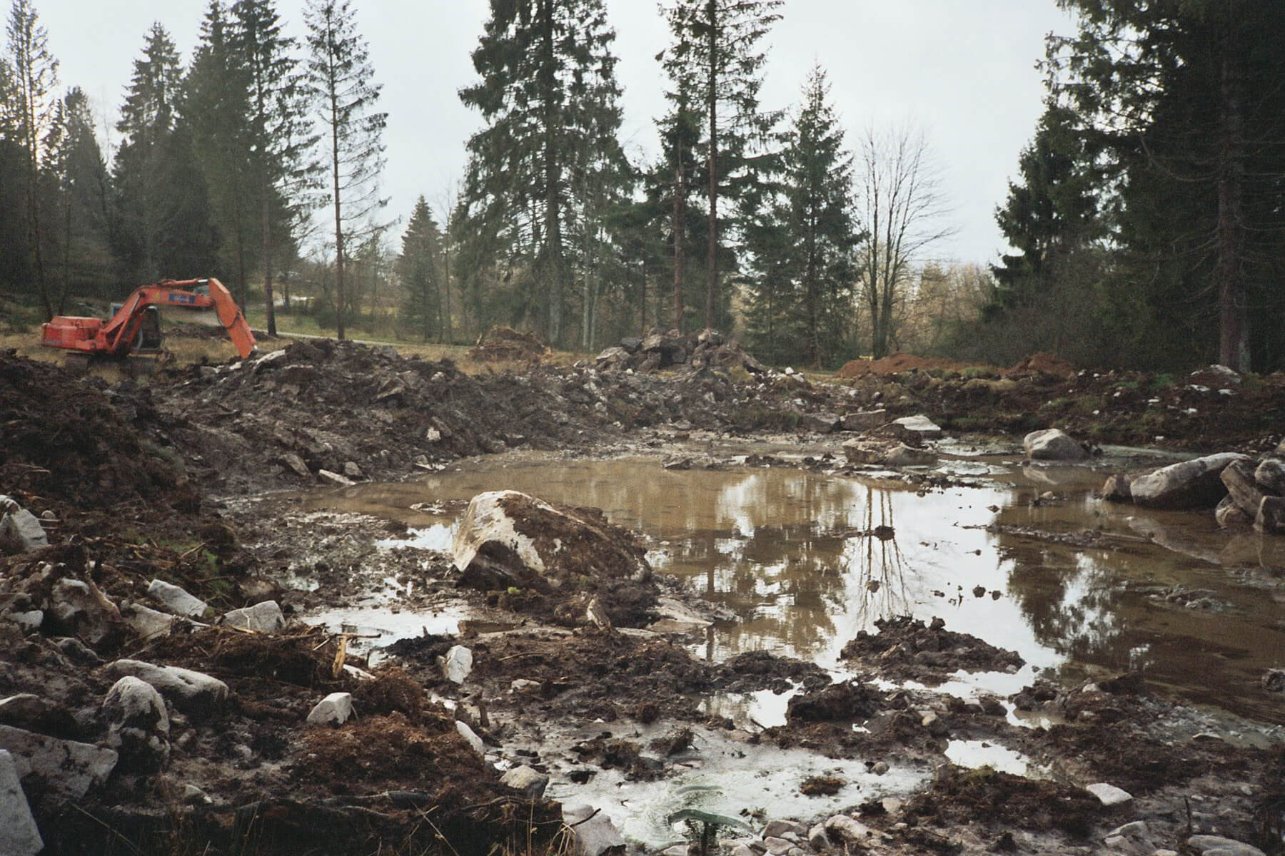 Im Jahre 2008 war es dann soweit. Eine Genehmigung bei der Gemeinde einholen, um bei Erhalt fest zustellen, dass sie bis 1000 qm Wasserfläche solche Bauvorhaben selbst genehmigen durfte und mein bescheidener Wunsch von ca. 400 qm so keine Probleme machte. Einen Bagger bestellt und los ging es. Sehr deutlich ist auf den Bildern zu sehen, dass die Südvogesen aus Granitgestein bestehen, was den Bagger gelegentlich an die Leistungsgrenze gebracht hat.