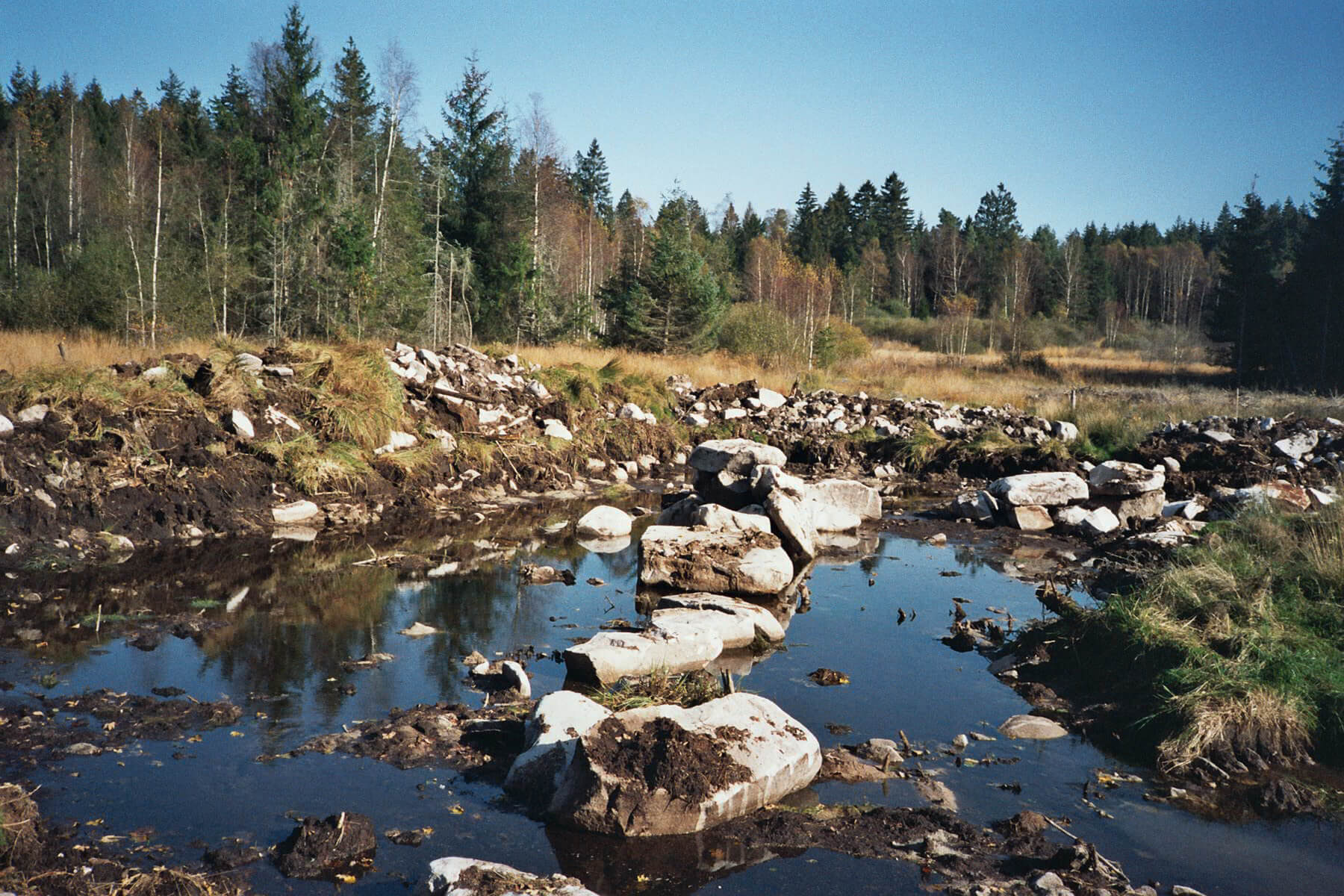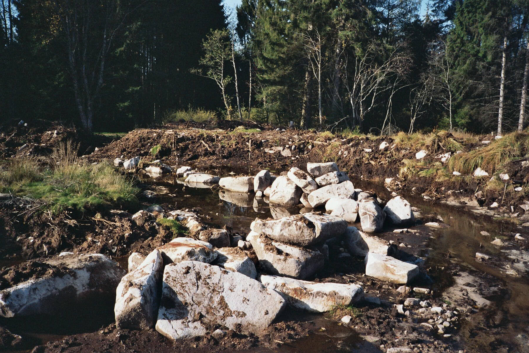 Das Gelände hier wird von einen Bach durchzogen, der sich aus dem Überlauf der Quelle und dem Oberflächenwasser des Hochmoores speist – ideale Bedingungen ein grösseres Gewässer mit Zu- und Ablauf anzulegen.