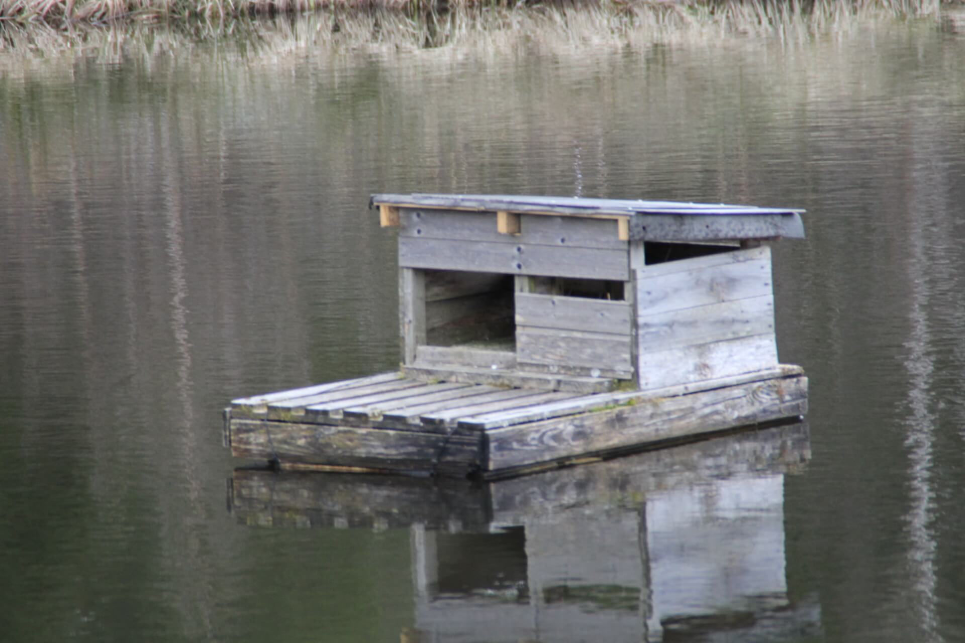 Bevor der Weiher gebaggert wurde, nisteten in dem sumpfigen Gelände in jedem Frühjahr schon Wildenten. Was lag also näher, als ihnen einen sicheren komfortablen Brutplatz mitten auf dem Wasser zu schaffen?