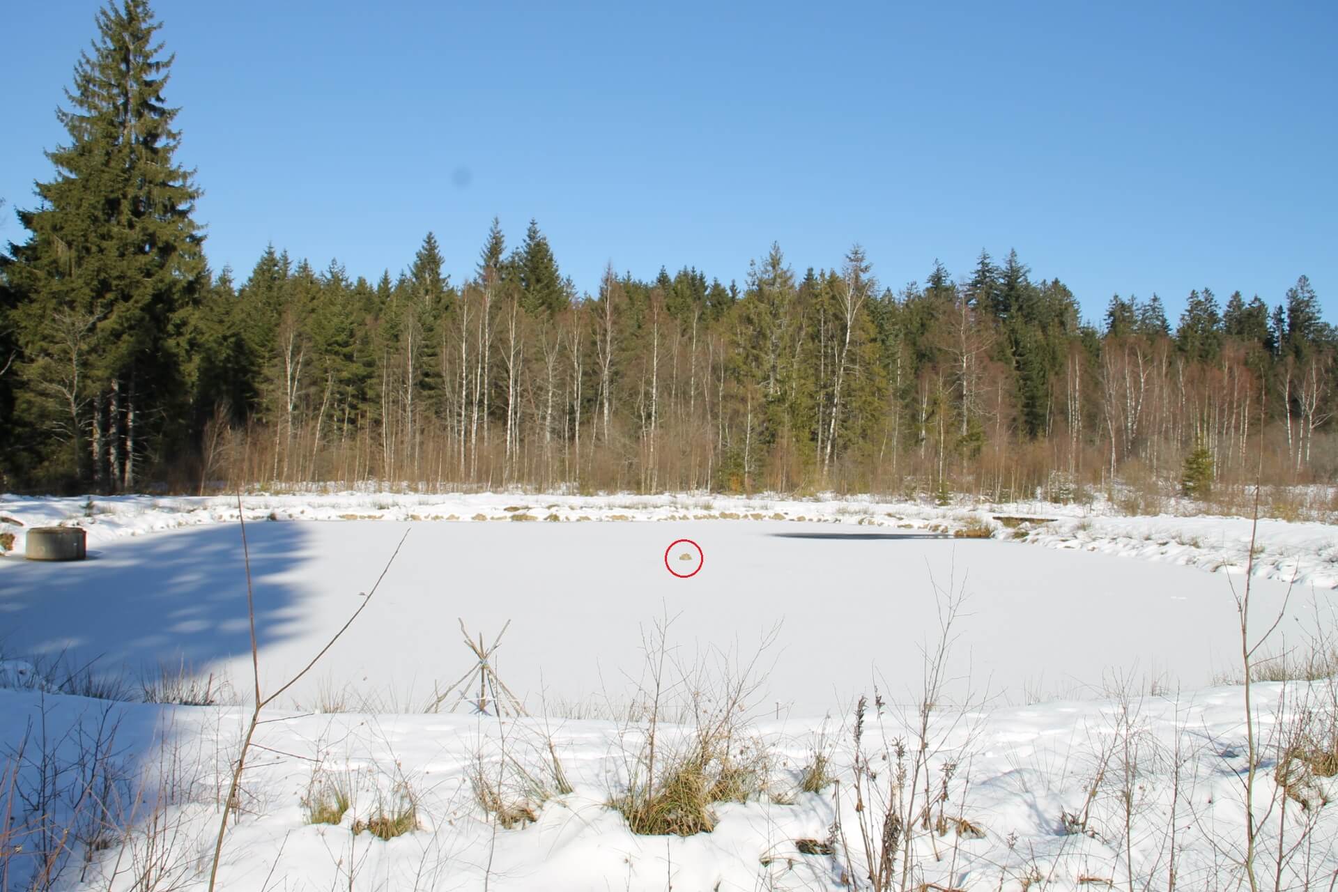 Ein Bruthaus auf dem Wasser brauchte aber eine Fixierung am Grund, also eine Art Anker. Ich bohrte also in einen ca. 15 kg schweren Stein ein Dübelloch für eine Öse, befestigte daran eine Kette, an deren Ende ein Stück Ballenschnur angebracht war, die eine Henkelflasche aus Kunststoff als Schwimmer fixierte, damit die Position des Anker wiedergefunden werden konnte. Die Idee war, den Ankerstein in der Mitte auf dem Eis des zugefrorenen Weihers zu platzieren, wo er im Frühjahr während der Eisschmelze an seinen Platz am Grund des Weihers plumsen würde. Bis hierher ging mein Plan auf.