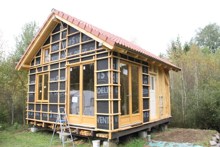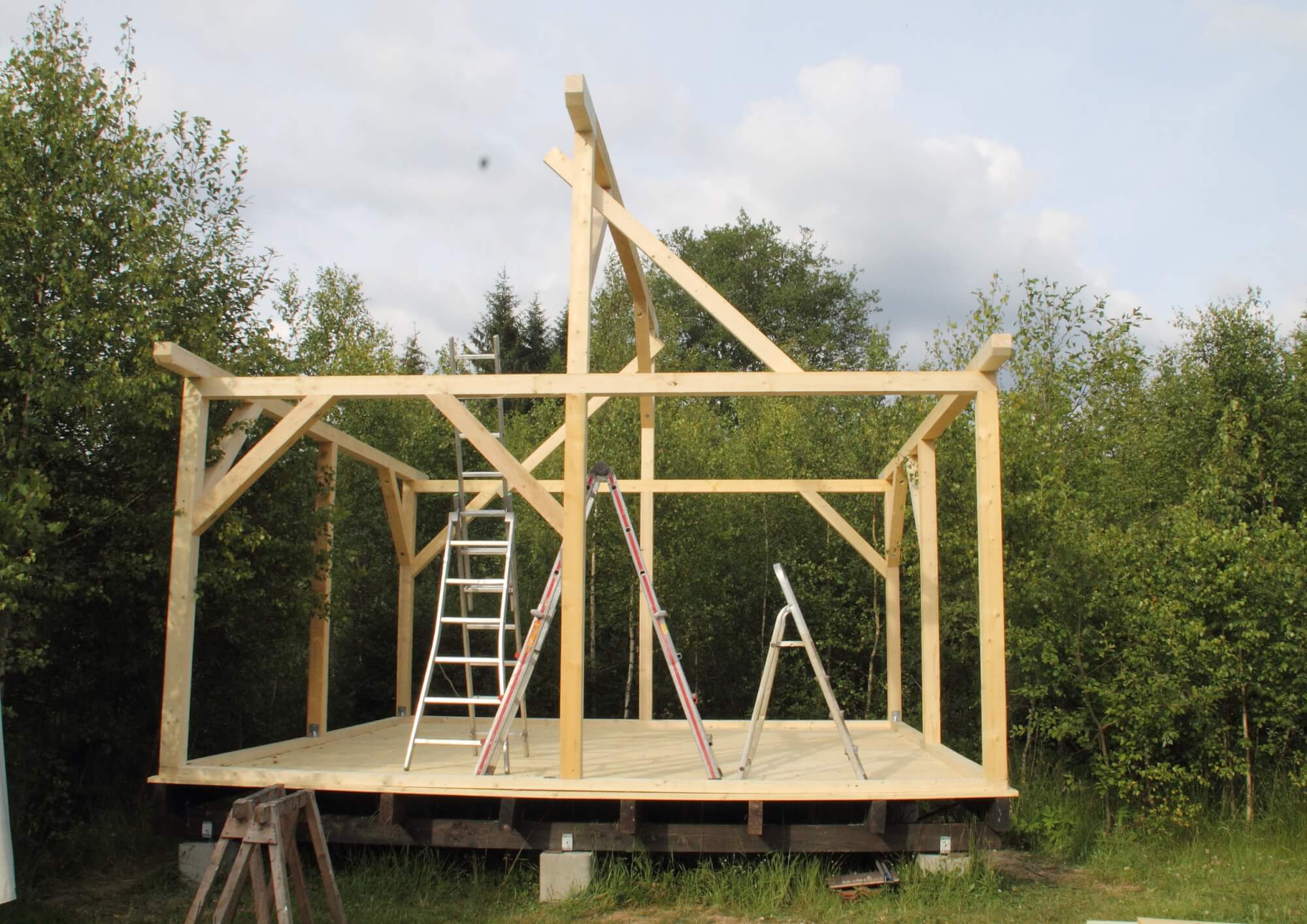 Ermutigt durch Bekannte, die der Meinung waren, dass ich einfach hätte bauen sollen ohne zu fragen, ging es dann 1 Jahr später mit dem Aufrichten des Fachwerkes weiter. Diese Arbeiten habe ich mit einem befreundeten Zimmermann ausgeführt. Bei der Anbringung der OSB Platten „über Kopf“ in den Dachschrägen hatte ich ebenfalls Helfer. Gedämmt wurde mit 12 cm Mineralwolle. Die Wetterschicht besteht aus Lärchenbrettern.