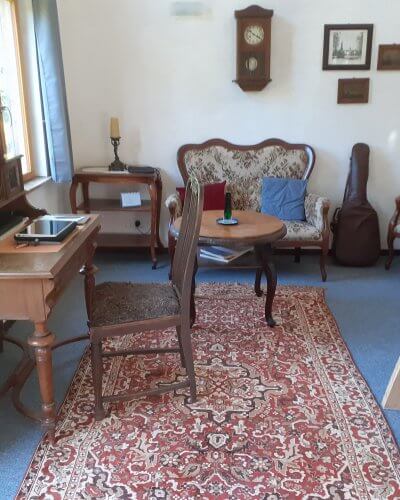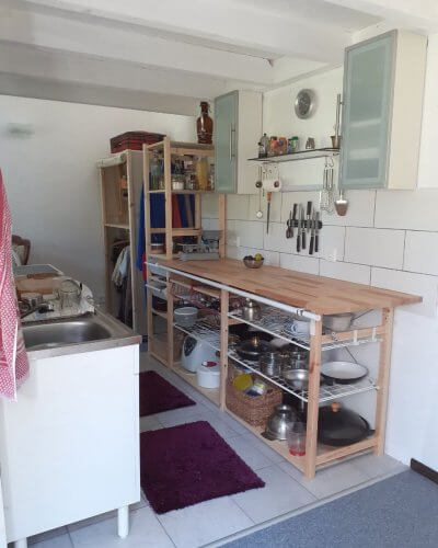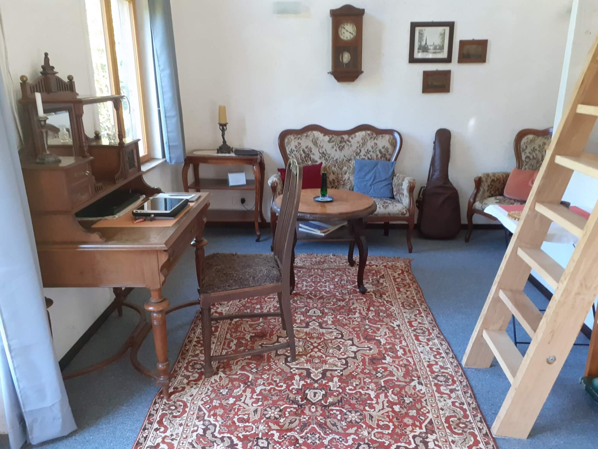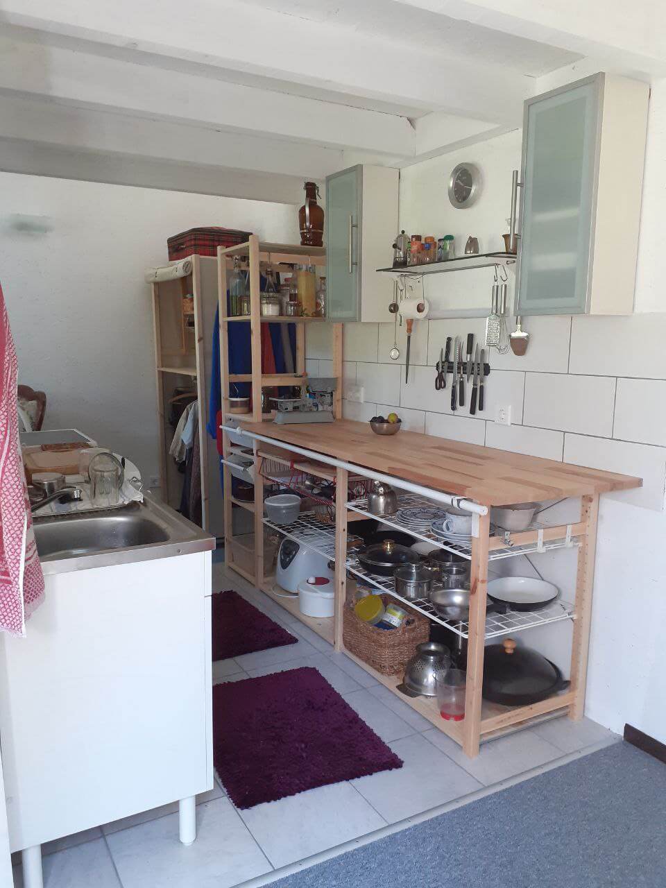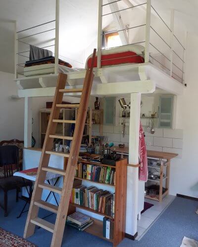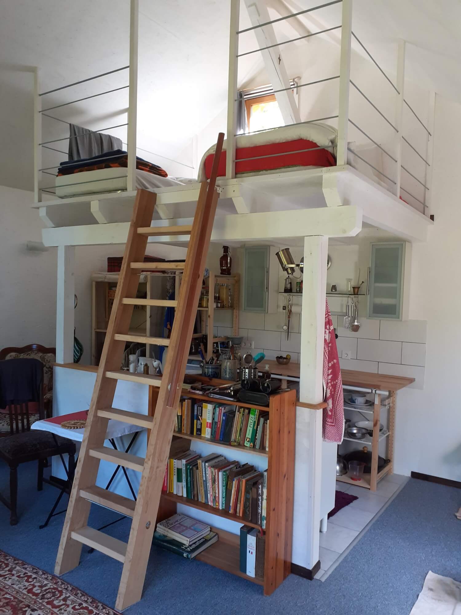 Nach 2 weiteren Jahren „kreativer Pause“ setzte ich die Bauarbeiten 2019 fort. Über der Wohnküche entstand eine Schlafempore für 2 Personen mit Stehhöhe im Bereich des Dachfirsts. Die innere Ausstattung erfolgte fast ausschliesslich mit Gebrauchtmöbeln, -geräten und Inventar aus der Auflösung des Hauses meiner Eltern.