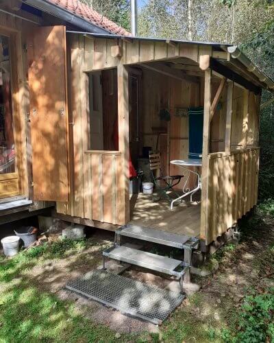 Ein einfacher Vorbau ermöglicht es, trockenen Fusses in das Chalet zu kommen und Platz für Asche- und Restmülltonne zu haben. Der Platz reicht auch, einen Tisch mit 2 Stühlen aufzustellen, wenn man bei Regen draussen, aber trocken sitzen möchte.
