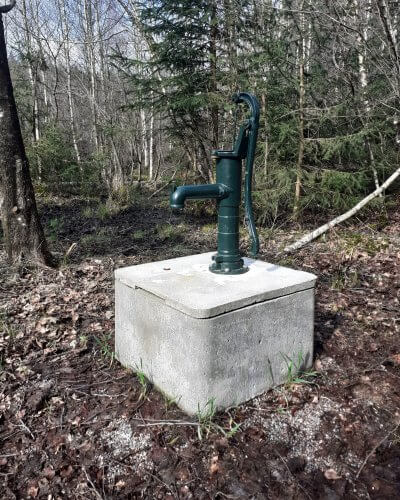 Um unabhängig von der Wasserversorgung des Chalets mit Quellwasser zu sein, errichtete ich im Jahr 2019 noch eine Wasserentnahme mit einer Schwengelpumpe. Da wegen der Steine nicht tiefer als 2 m gebohrt werden konnte, gewinnt man lediglich Oberflächenwasser, welches aber schon nach ca. 20 cm Tiefe ansteht. Es bleibt nur noch, das Wasser zu filtern, sofern es als Trinkwasser benützt werden soll.