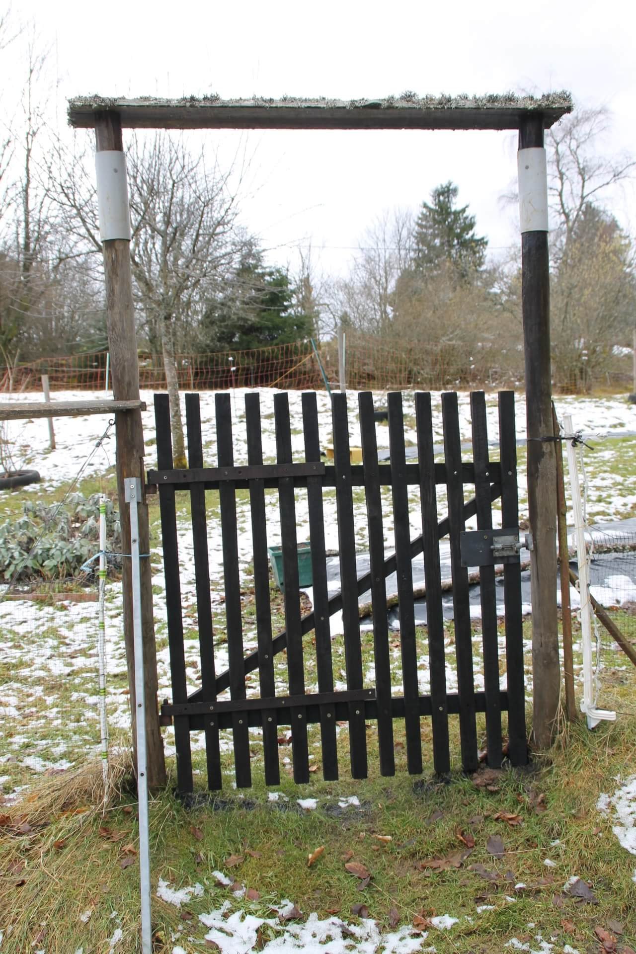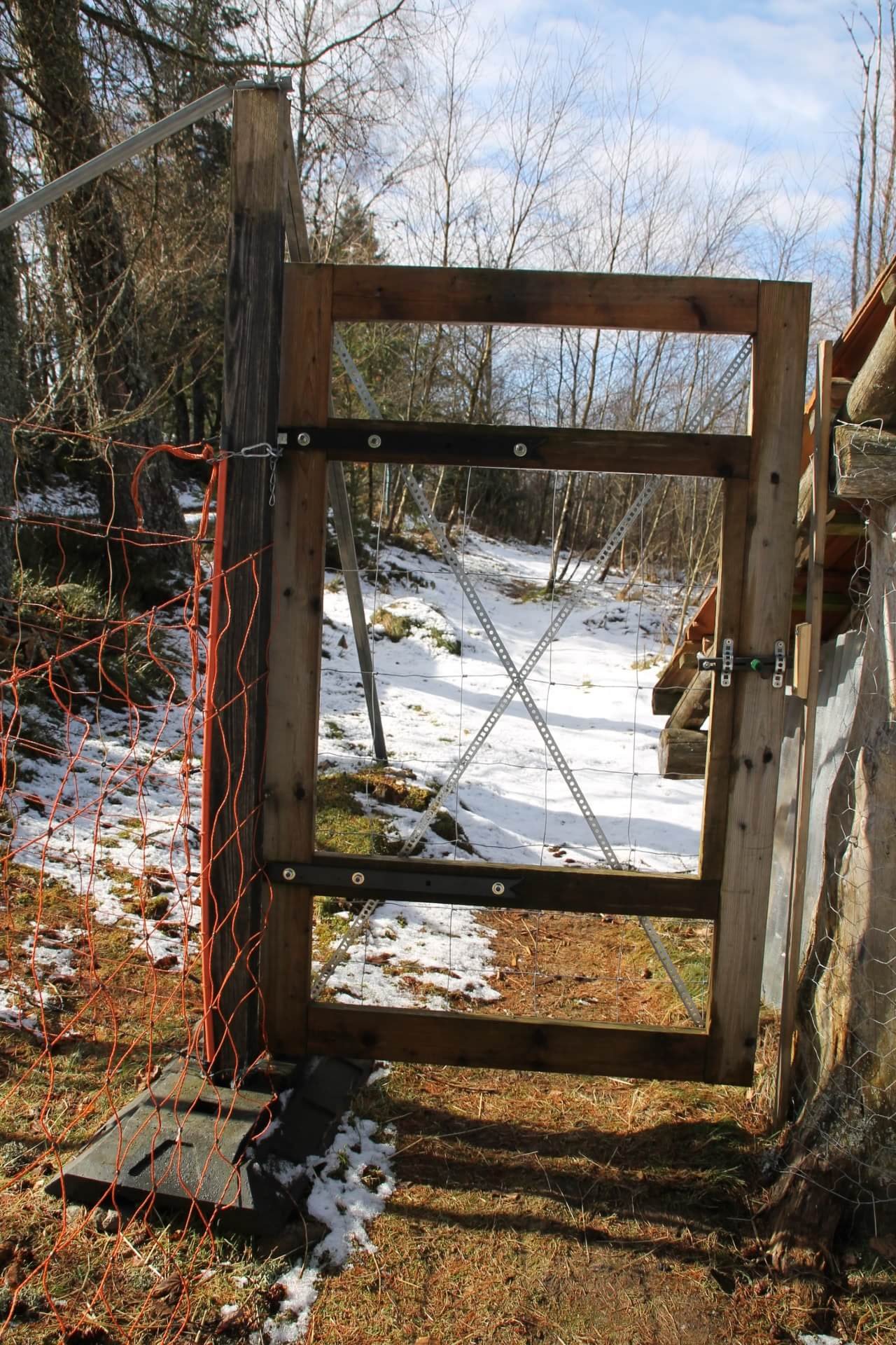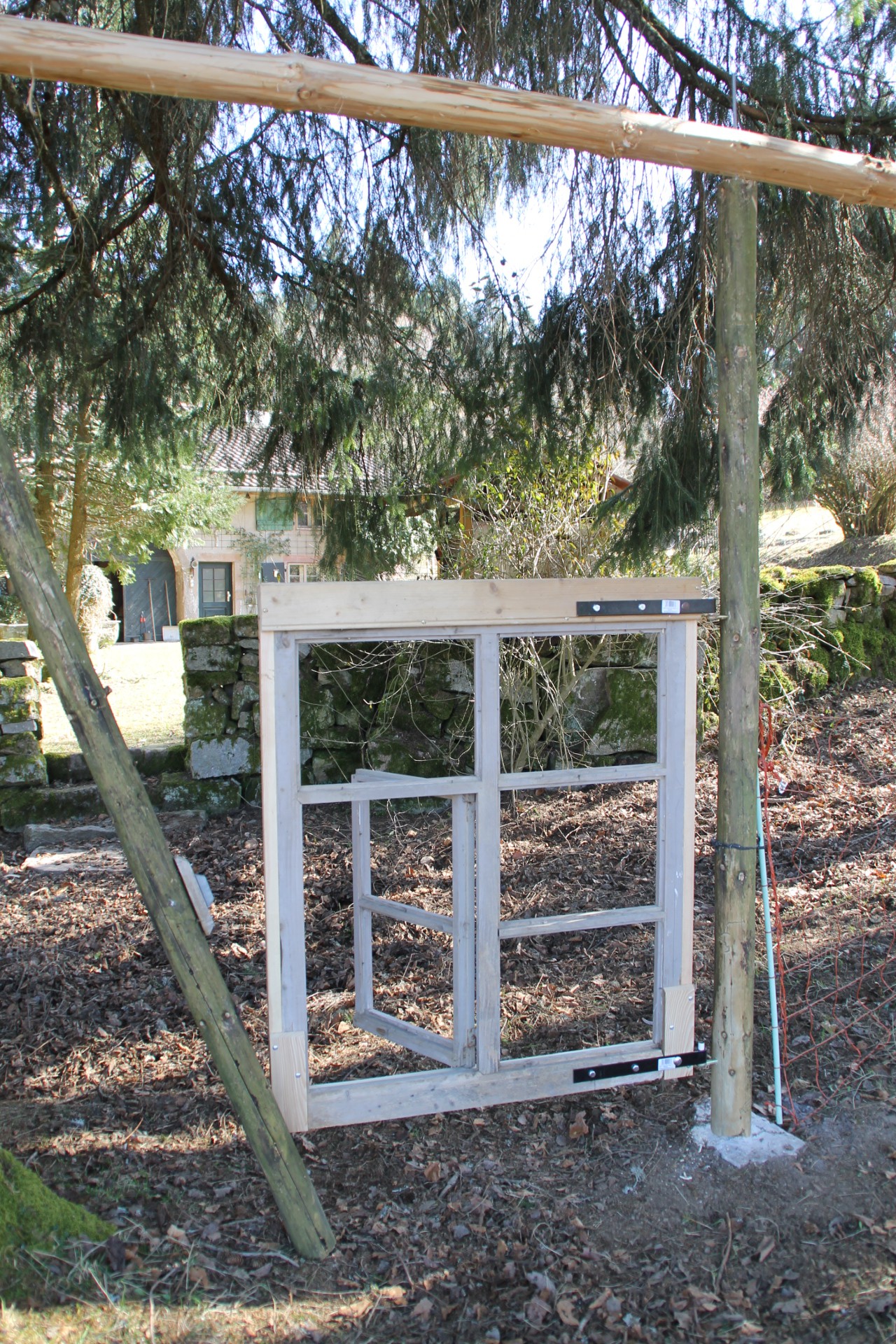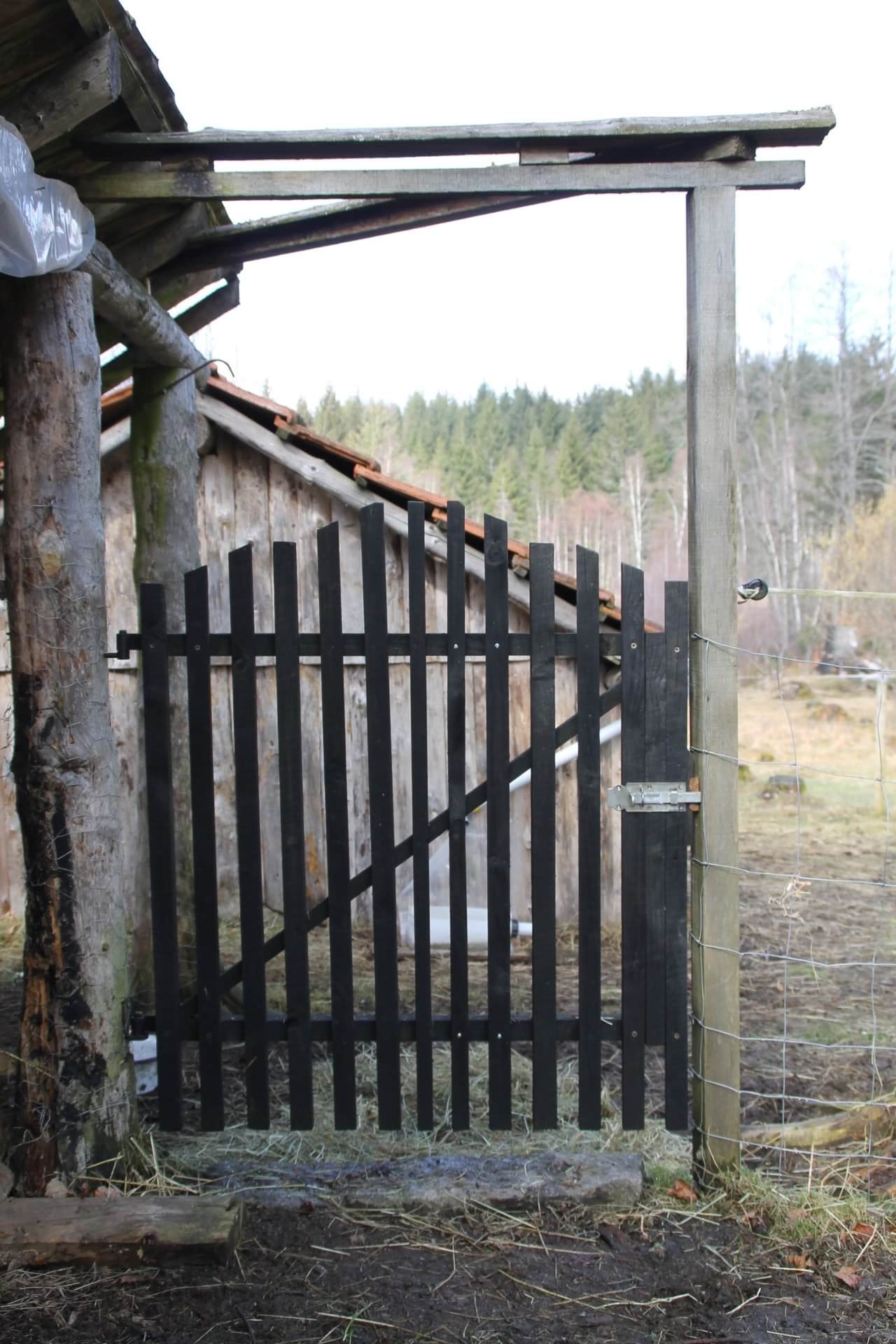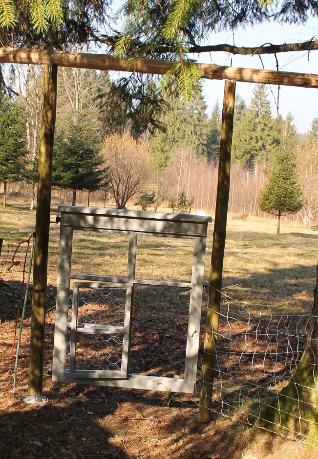 Die Pfosten und der Querbalken sind aus dem Wald, das Tor entsteht aus einem alten Fenster mit einem „Lämmer- bzw. Hundeschlupf“