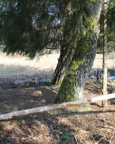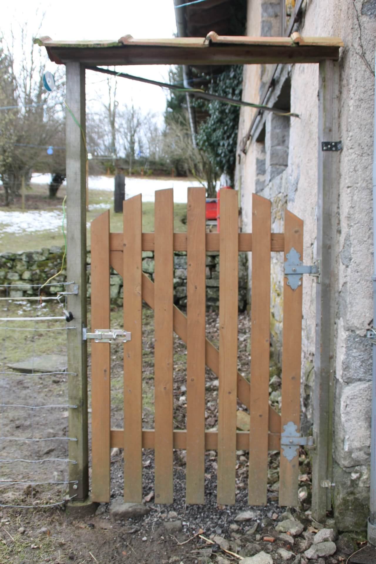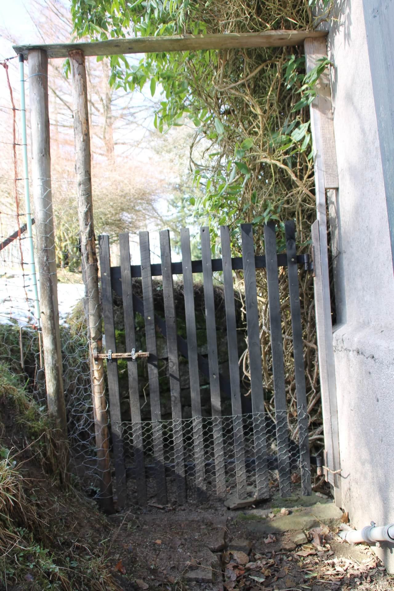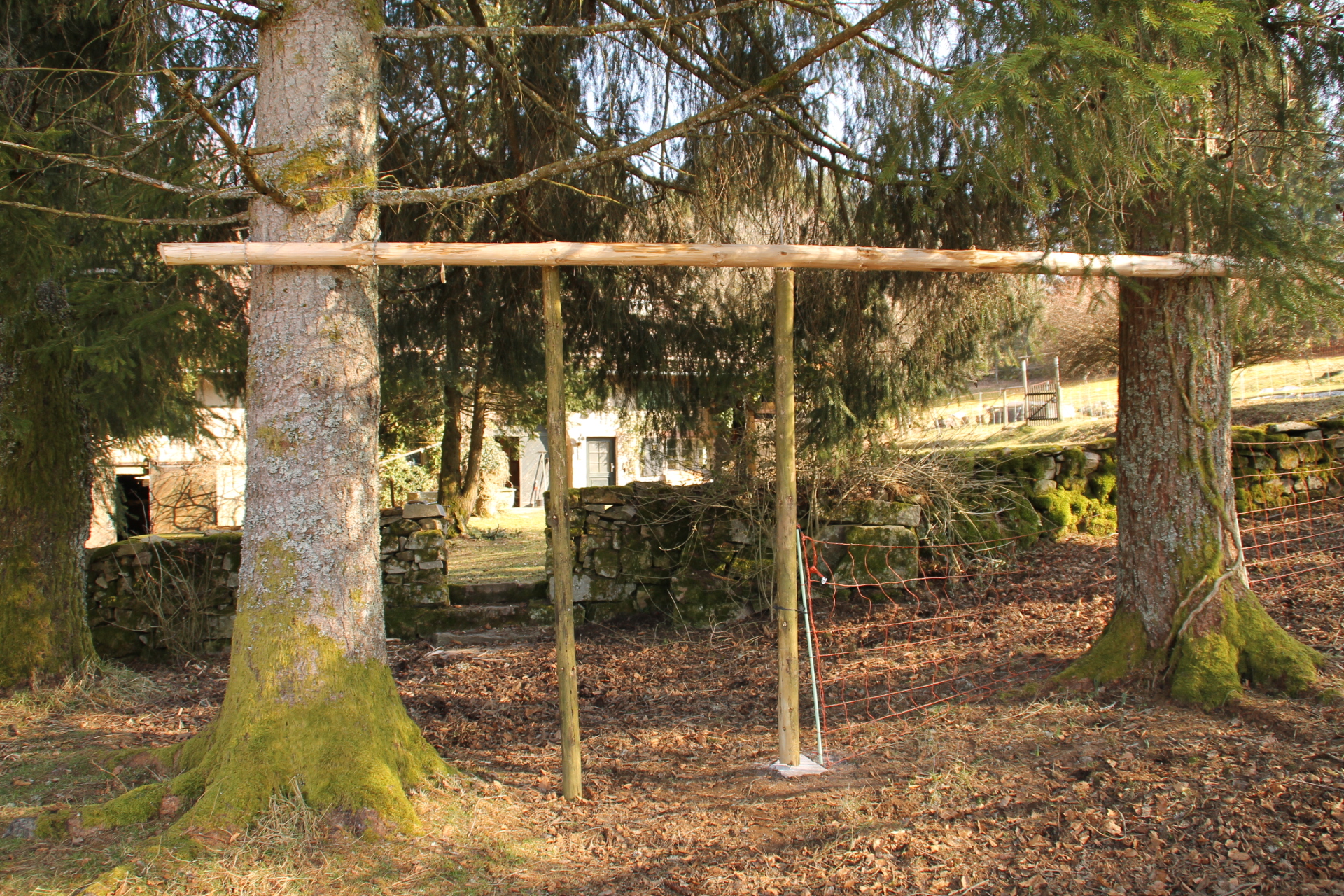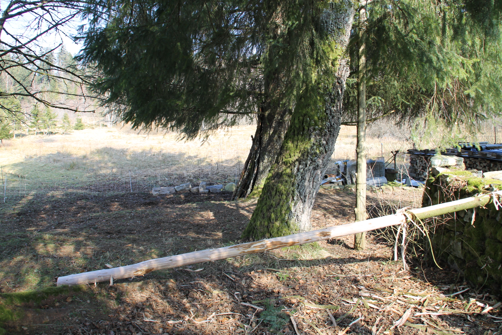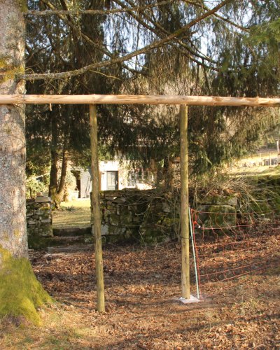 Die Pfosten und der Querbalken sind aus dem Wald, das Tor entsteht aus einem alten Fenster mit einem „Lämmer- bzw. Hundeschlupf“