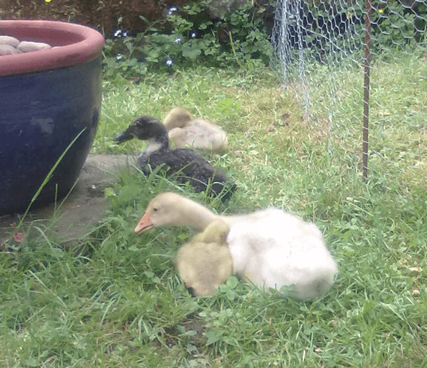 Im Alter von 6 Wochen gab ich sie der „Sippe“ zurück, weil ich wusste, dass diese sich nun fortan rührend um „ihren“ Nachwuchs kümmern würde – ja selbst 1 kleine Ente, die bei einem nächtlichen Marderbesuch als einzige von 8 überlebt hat, wurde anstandslos von der Gänsefamilie adoptiert. Bis zu deren plötzlichen Tod lief diese Ente ausschliesslich mit den Gänsen mit und ignorierte vehement ihre eigene Art. Wenn die Gänse auf der Wiese grasten, suchte sie eben tierische Kost und schwimmen auf dem Wasser stellte ja ohnehin kein Problem dar.