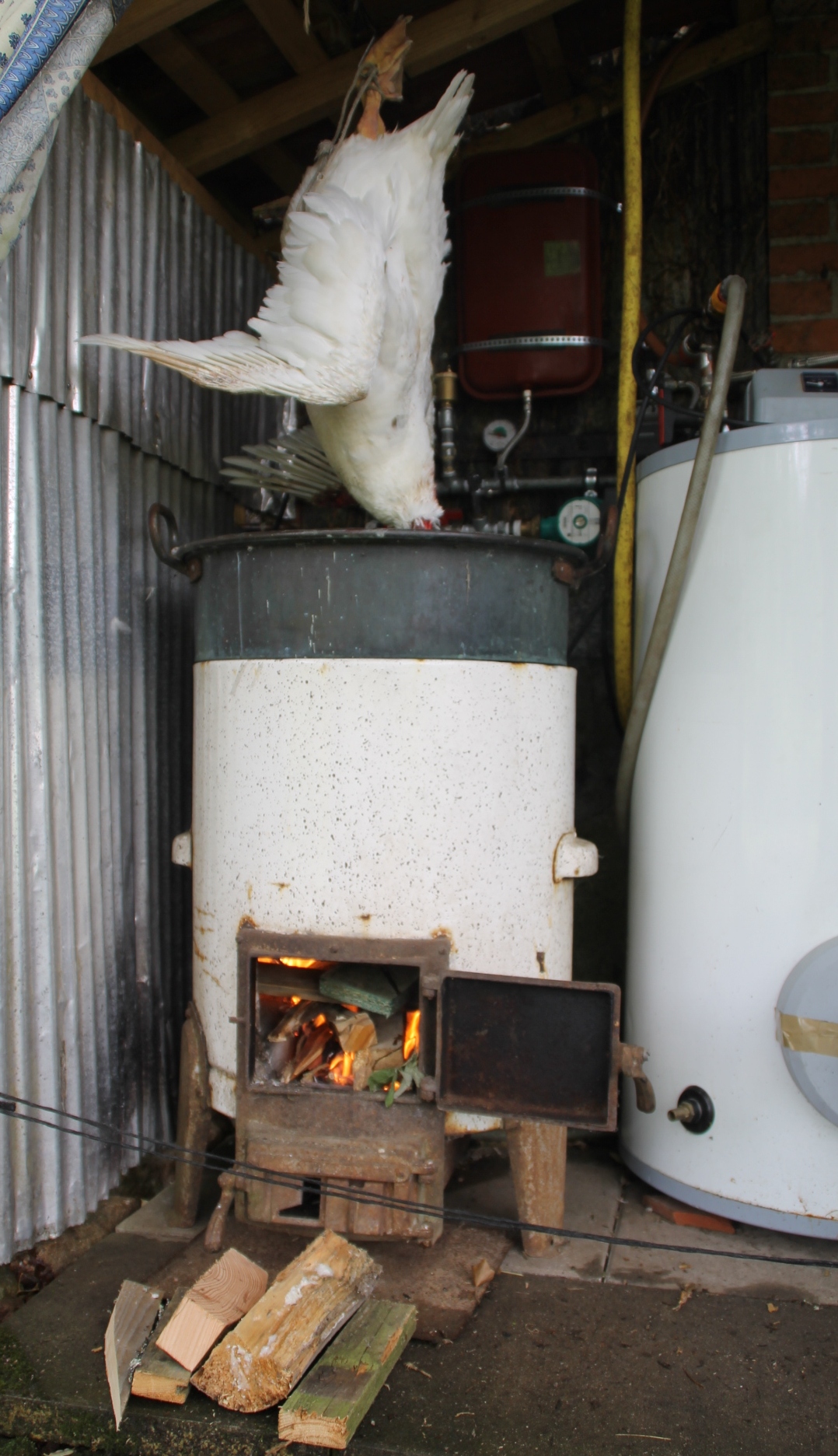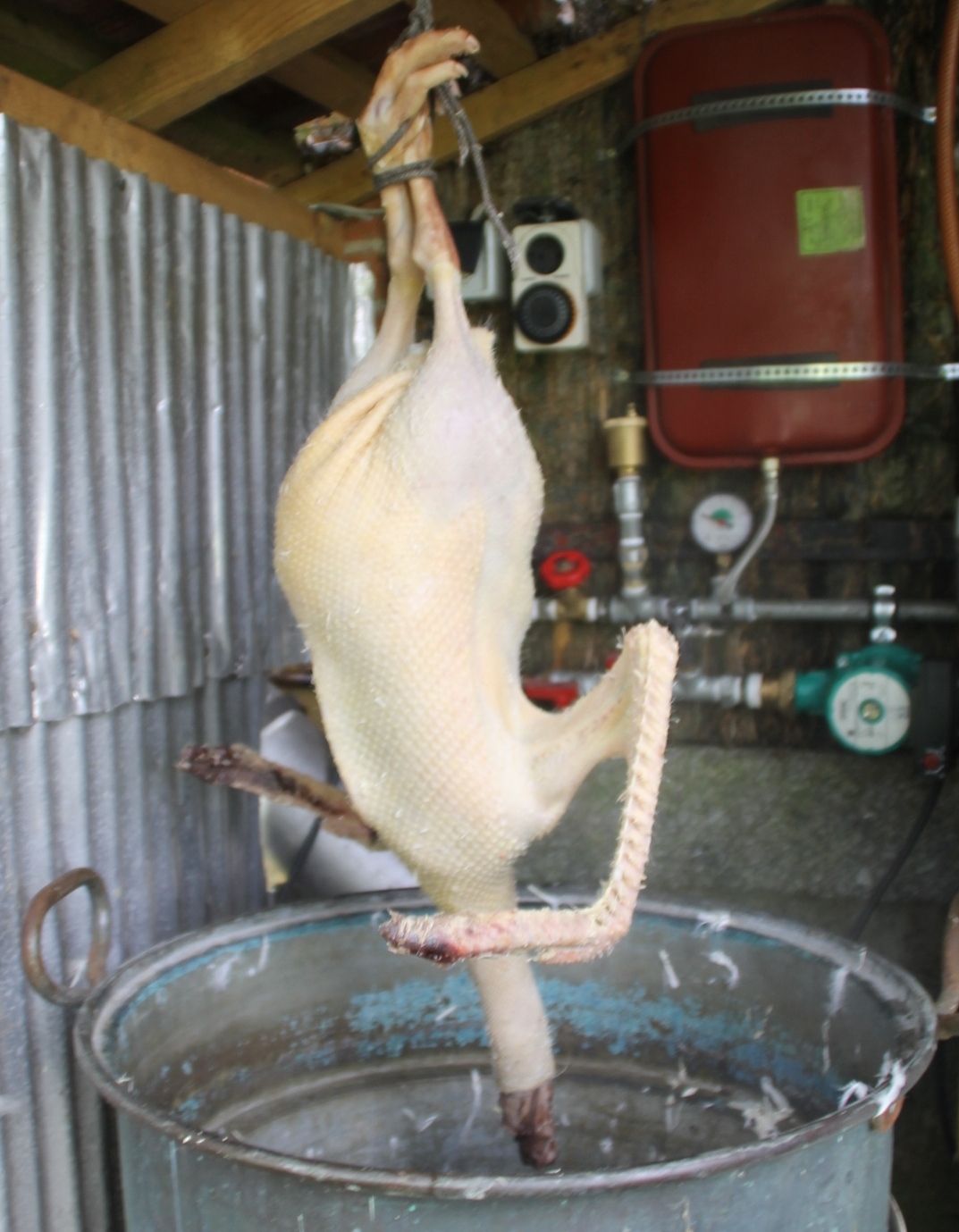 Eine Gans ist beim Gründeln am Teichrand derart mit dem Kopf in den Steinen hängen geblieben, dass ich Mühe hatte, das ertrunkene Tier aus dieser Verkeilung heraus zu ziehen. Da die Gans noch warm war, konnte sie noch notgeschlachtet werden. Das bedeutet: In diesem Jahr ist St. Martin schon zu Johanni!