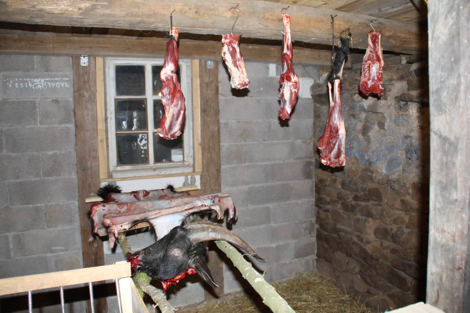 Bevor das Fleisch eingefroren oder geräuchert wird, hängt es 3-4 Tage im Kühlen ab (mittleres Bild).