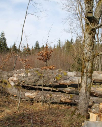 Da Nadelholz sehr astreich ist und im Vergleich zu Hartholz wie Buche und Eiche auch nur 1/3 von deren Heizwert hat, lohnt sich das Kleinschneiden eigentlich nicht. Am Platz verrotten lassen wollte ich dieses Monstrum aber auch nicht und so blieb nur das Kleinschneiden in Salamitaktik übrig.