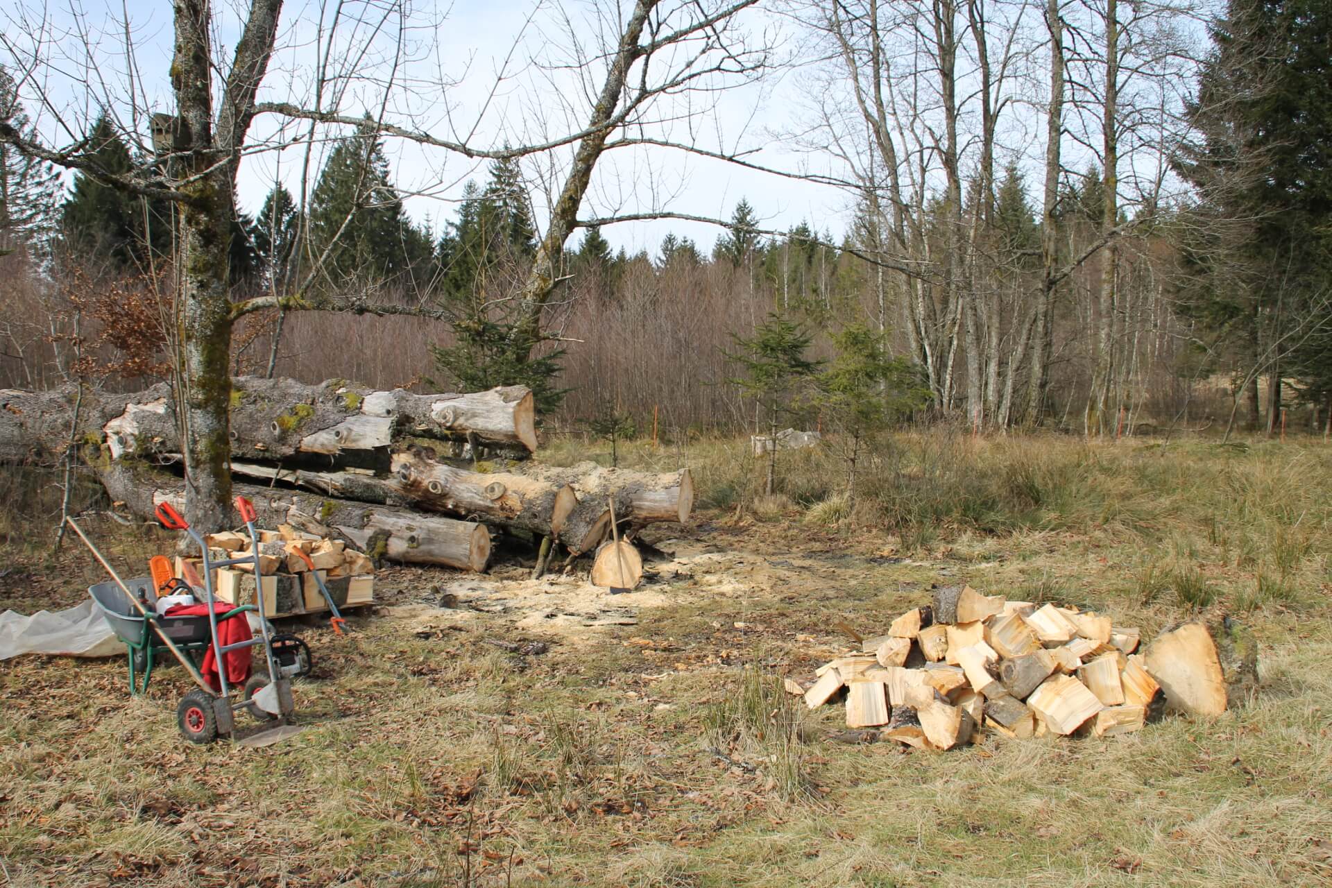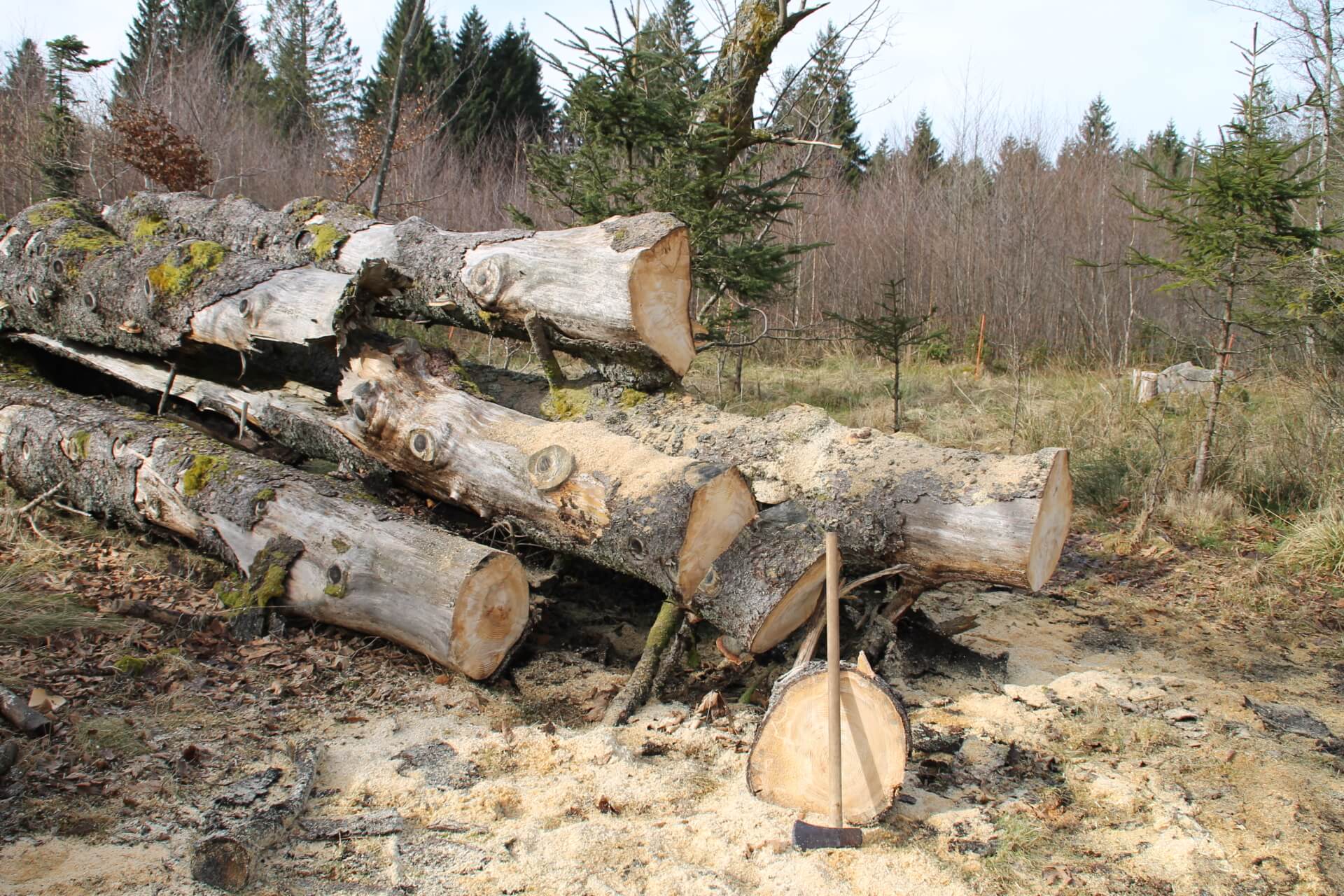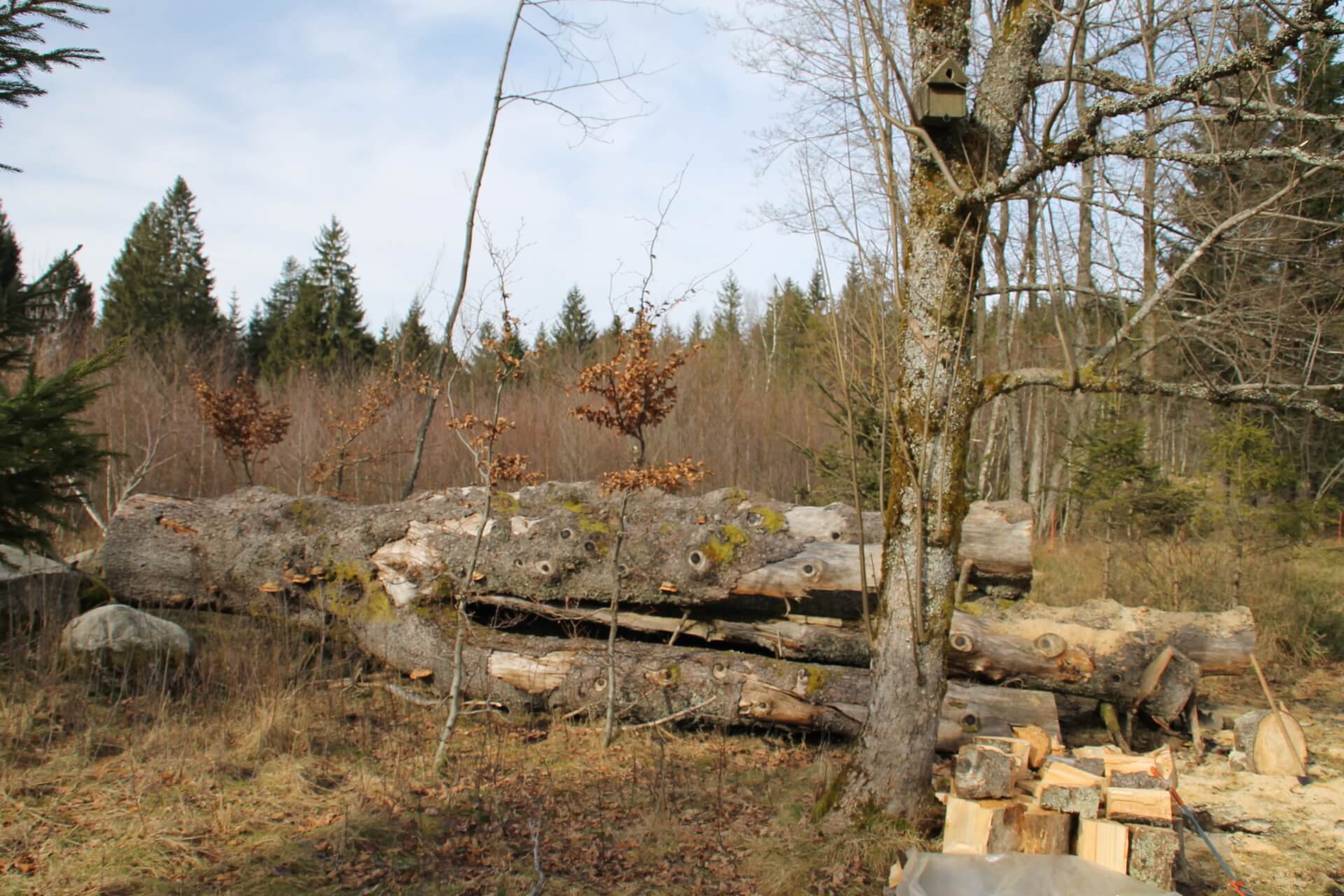 Es wurde Zeit, die alte Fichte, die ein Wintersturm 2010 aus den „Angeln“ gehoben hat, aufzuarbeiten, also zu Brennholz zu machen.
