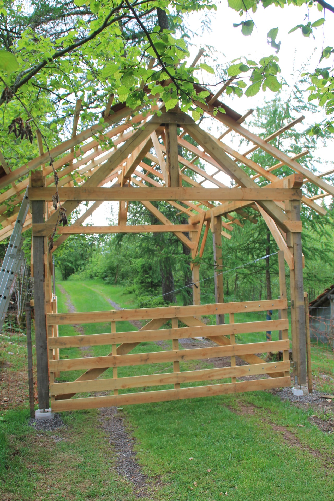 Das Problem: Wie kommen die Schafe und Ziegen stressfrei für Mensch und Tier von einer Weide auf die andere, wenn dabei der Zufahrtsweg überquert werden muss? Indem 2 Tore gebaut werden, die so angeordnet sind, dass sie morgens und abends als „Schleuse“ über die Zufahrt dienen, tagsüber die jeweils benutzte Weide abschliessen und gleichzeitig den Fahrweg freigeben. Nun bräuchten die dafür notwendigen Tore für diesen Zweck nicht unbedingt überdacht werden, aber man könnte ja das so entstehende Carré zusätzlich noch als überdachten Stellplatz – um das Wort „Carport“ zu vermeiden, nutzen. Bei Schlechtwetterperioden und im Winter, wenn die eine Weide ohnehin nicht genutzt wird, entstünde doch „ganz nebenbei“ ein komfortabler überdachter Stellplatz! Und überhaupt, einen richtigen Eingang hatte das Anwesen ja auch noch nie. Für so eine Konstruktion aus Holz sprach auch, dass es nun einen Grund gab, die alten Fichten auf der Südseite des Hauses zu fällen, um einen Teil des Bauholzes zu gewinnen. Ausser, dass die grossen Fichten morgens den Garten beschatteten, gab es bisher kein gescheites Argument dafür, sie zu beseitigen.
