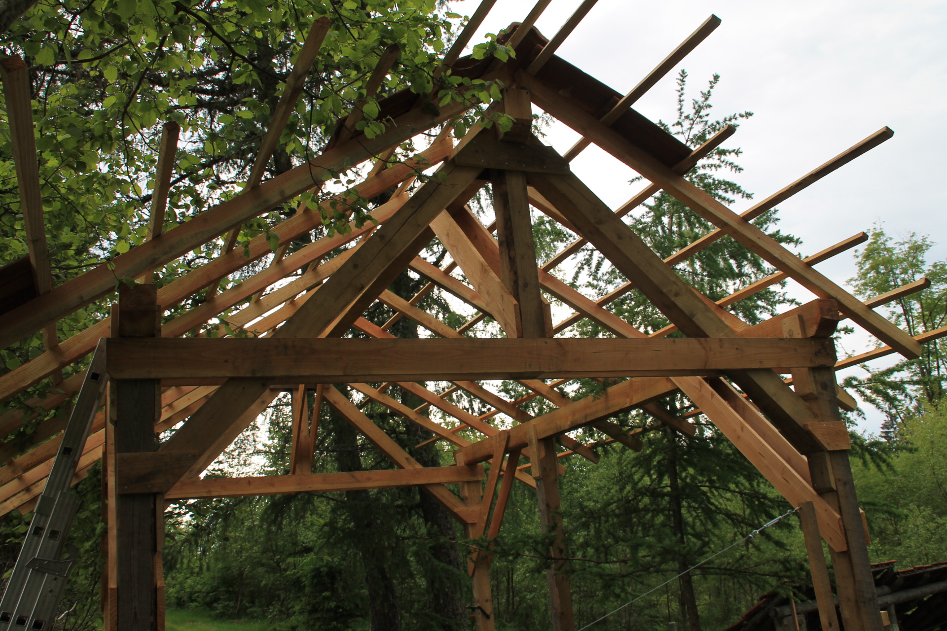 Die Herausforderung bestand auch darin, die Konstruktion unter Vermeidung von Montagewinkeln zu bauen, aber auch die aufwändig herzustellenden Verzapfungen zu umgehen. Dies liess sich mit Hilfe von Holzknaggen, -zangen und Brettauflagen für die Bügen realisieren. Die Deckung erfolgte mit gebrauchten Dachziegeln, die bei der Indachmontage einer Photovoltaikanlage, so gut wie neuwertig, bei Bekannten angefallen sind.