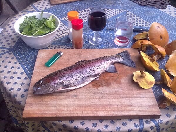 Dann gibt’s eben heute Forelle mit Salat aus dem Garten und Pilzen die in der Einfahrt wachsen.